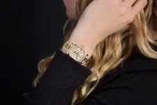 Questo orologio tutto in oro giallo a 18 carati è abbastanza grande, avendo un diametro da 34 millimetri. Sulla lunetta sono incastonati diamanti, mentre il movimento è automatico.