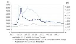 Va comunque ricordato che i prezzi del silicio sono ancora ben al di sopra dei valori pre-pandemici (1.884 euro per tonnellata DDP Europa) e quelli del magnesio superiori rispetto alla media quinquennale pre-pandemia (2.322 dollari per tonnellata DU Rotterdam).